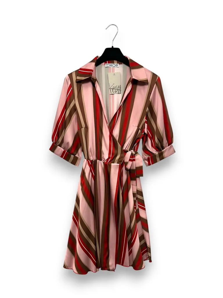 Descrizione Abito in raso a righe, a portafoglio con scollo incrociato
