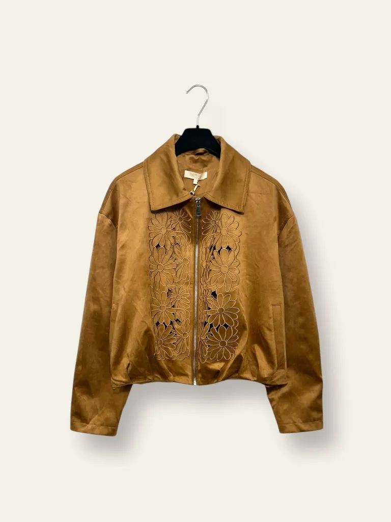 Descrizione La giacca camoscia con zip e fiori ricamati davanti