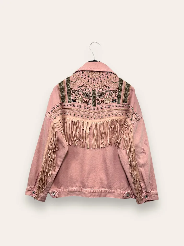 Descrizione Giacca in denim con ricamo, borchie e frange sulla schiena