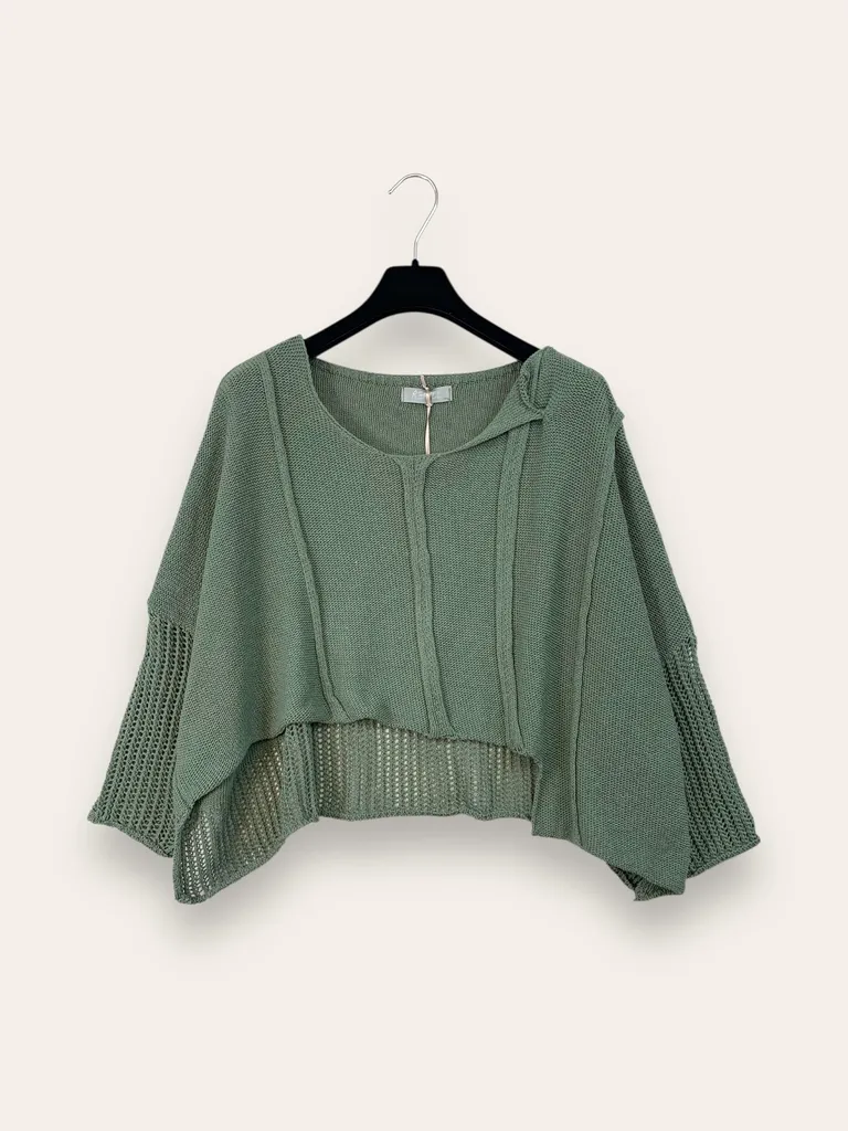 Descrizione Maglia girocollo over più corta davanti con maniche traforate