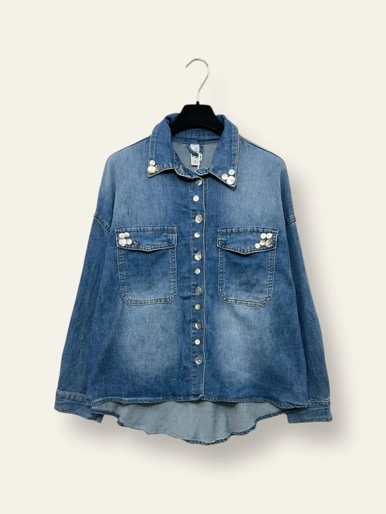 Descrizione Camicia in jeans più lunga dietro con bottoni effetto madreperla
