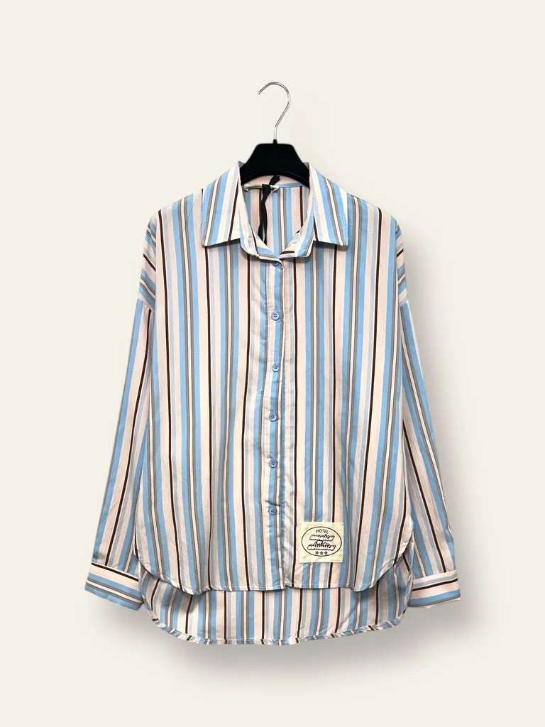 Descrizione Camicia a righe con stampa sulla schiena “hotel magico adriatico”