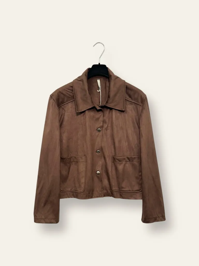 Descrizione Camicia crop a scatola in dainetto scamosciato, tasche frontali applicate