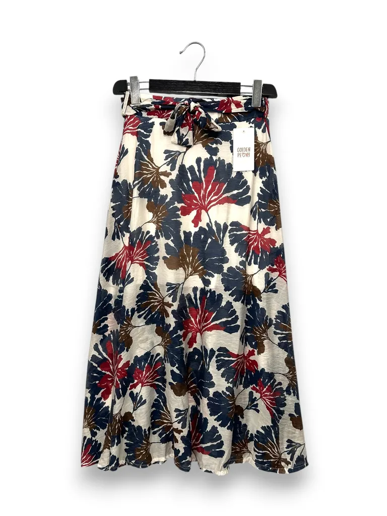 Descrizione Gonna midi svasata, fantasia foglie