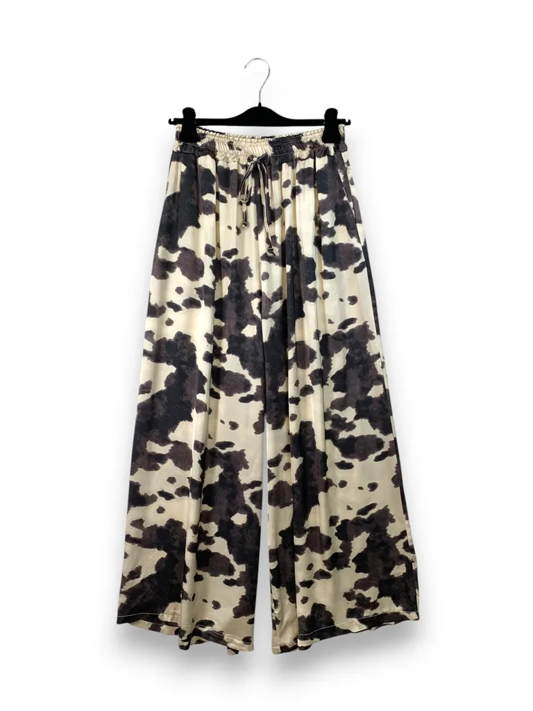 Descrizione Pantalone in viscosa a fantasia cavallino mucca con elastico in vita