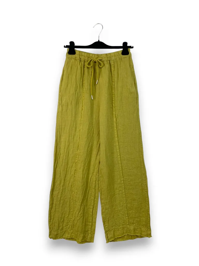 Descrizione Pantalone a palazzo in lino con riga davanti, elastico e coulisse in vita