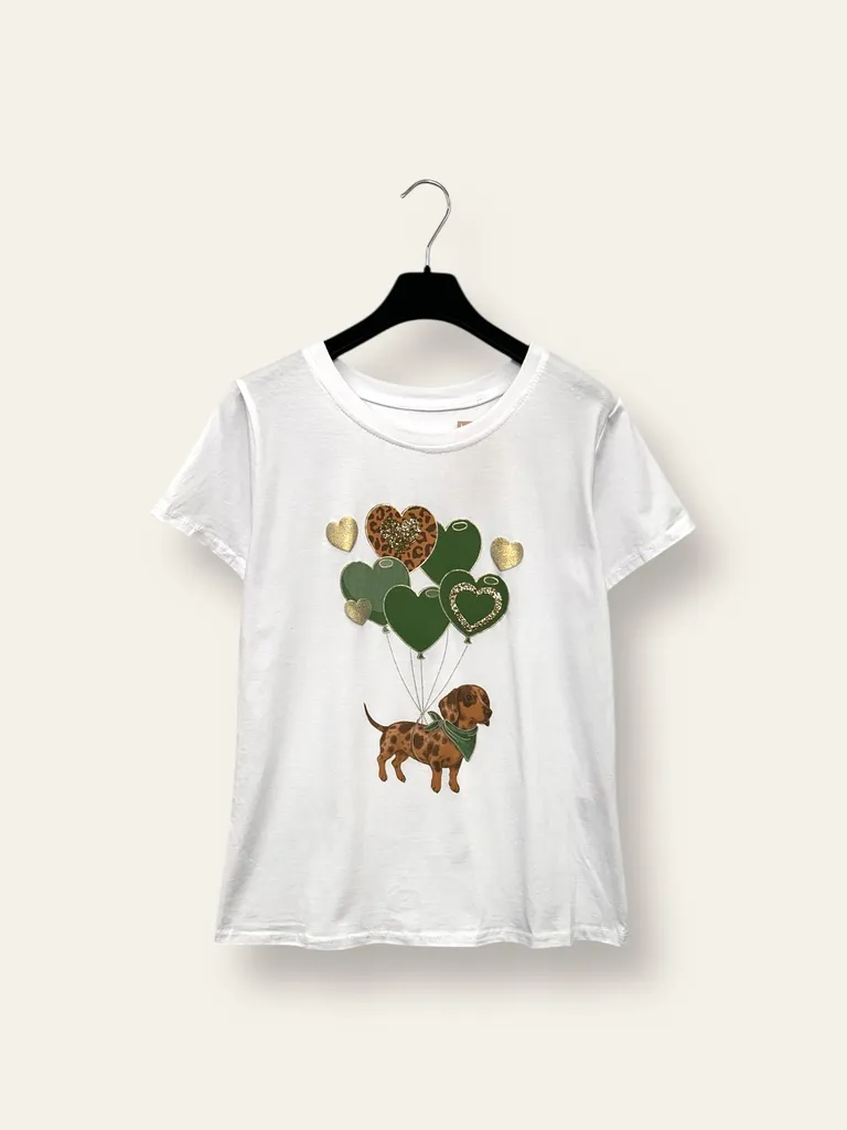 Descrizione T-shirt stampa cane con palloncini a cuore
