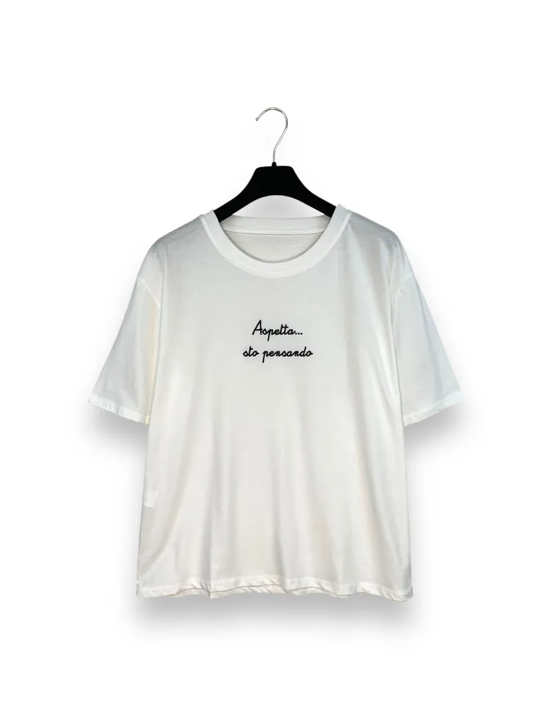 Descrizione T-shirt con scritta “ Aspetta… sto pensando” ricamata