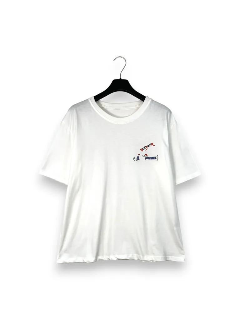Descrizione T-shirt con bassotto e gatto ricamato “Bonjour”