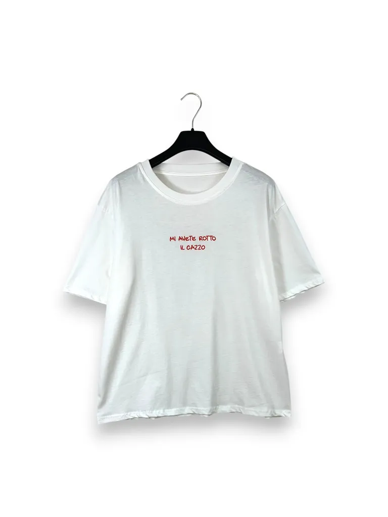 Descrizione T-shirt con scritta ricamata “ mi avete rotto il cazzo ”