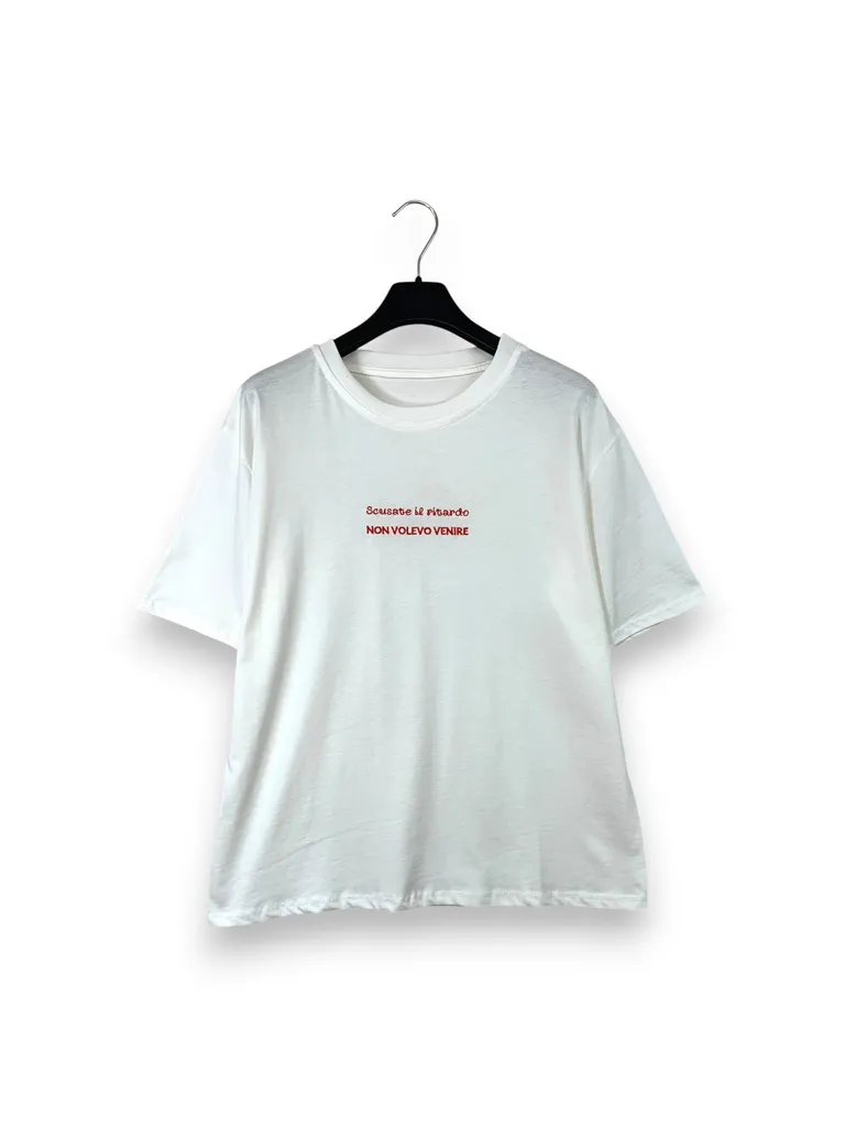 Descrizione T-shirt con scritta ricamata “ scusate il ritardo non volevo venire ”
