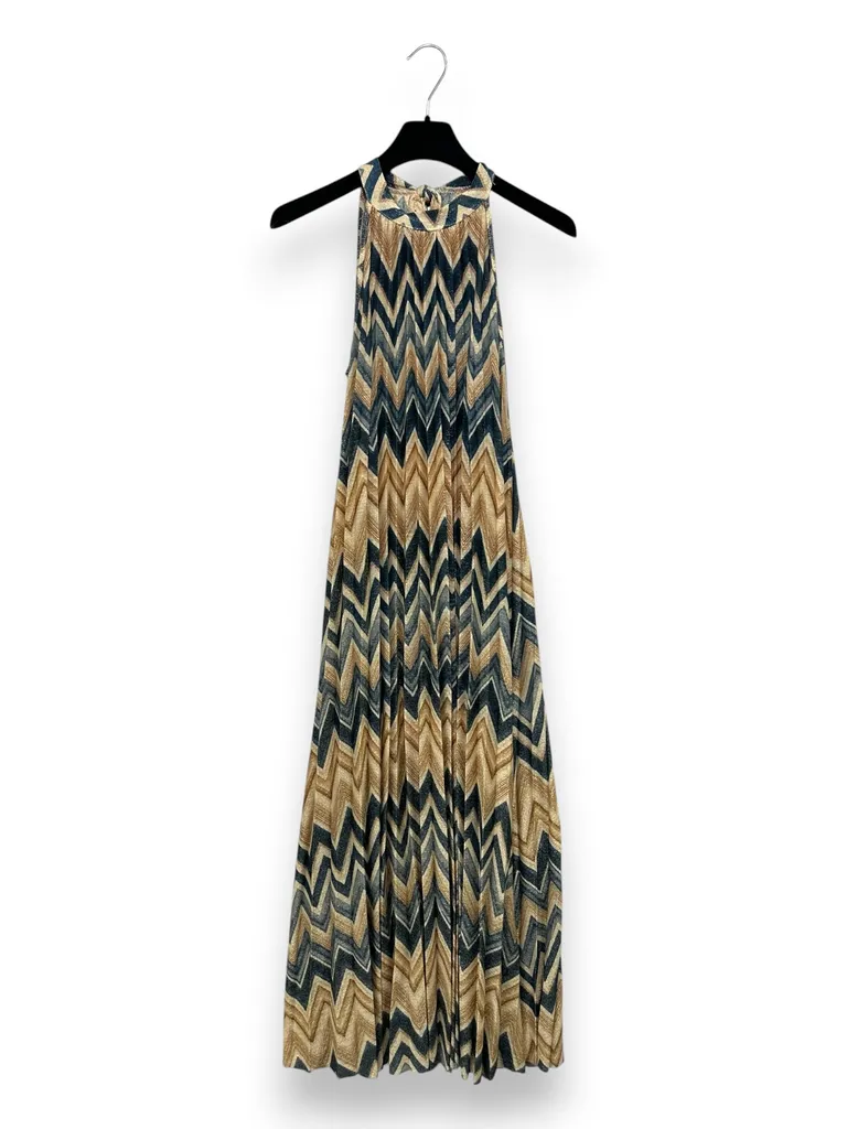 Description Abito lungo fantasia geometrica con lurex, spalle all’americana