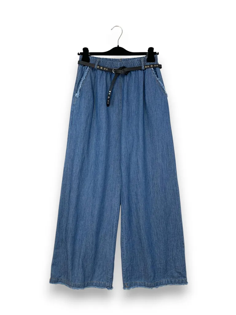 Description Pantalone a palazzo in chambray con elastico in vita, sfrangiato sul fondo