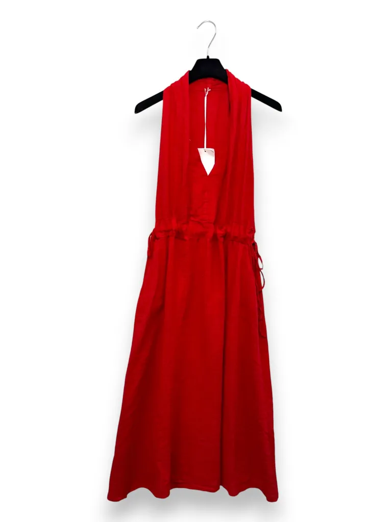 Description Abito lungo in lino, spalle all’americana, scollo a V e coulisse in vita