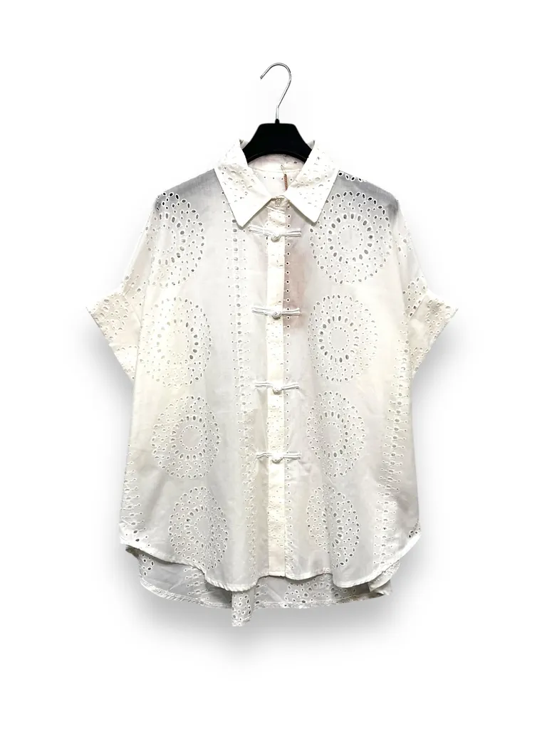 Description Camicia oversize in sangallo, chiusura orientale