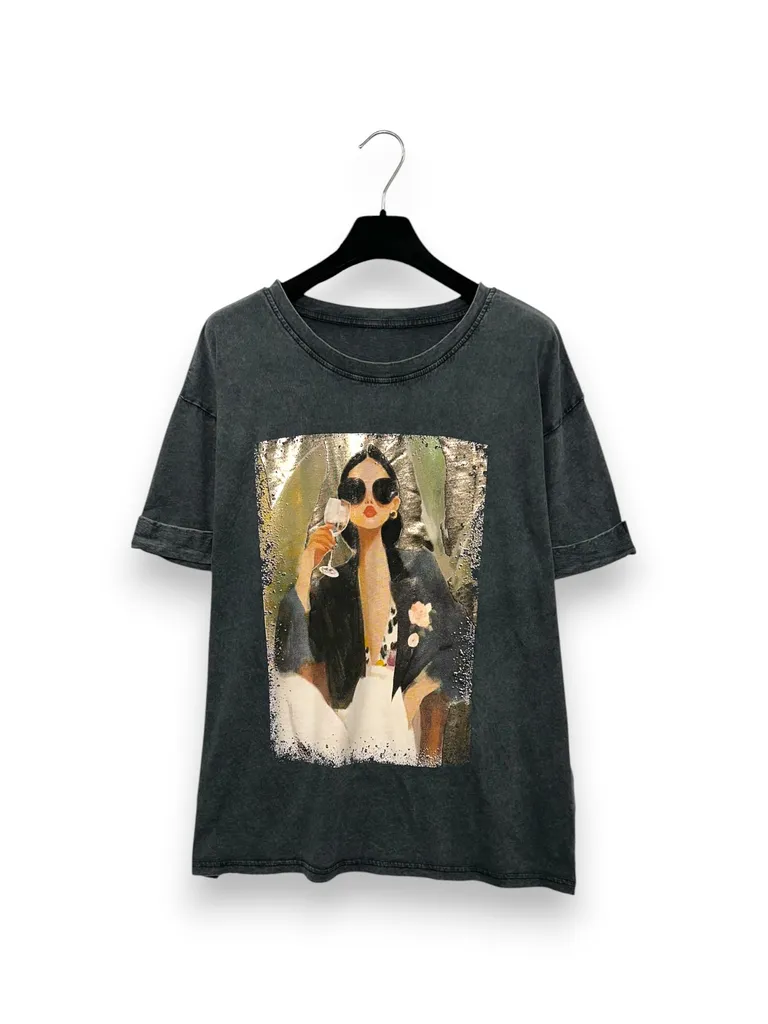 Description T-shirt over stone washed stampa donna con bicchiere di vino